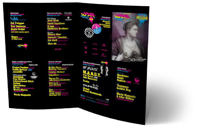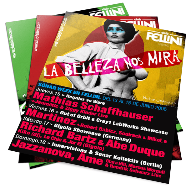 „...dieses neuen Club Konzept, mit einem starken Grafik Image von Manel Moedano von Biographics Design, hat das flyer designen zu Kunst gemacht...”